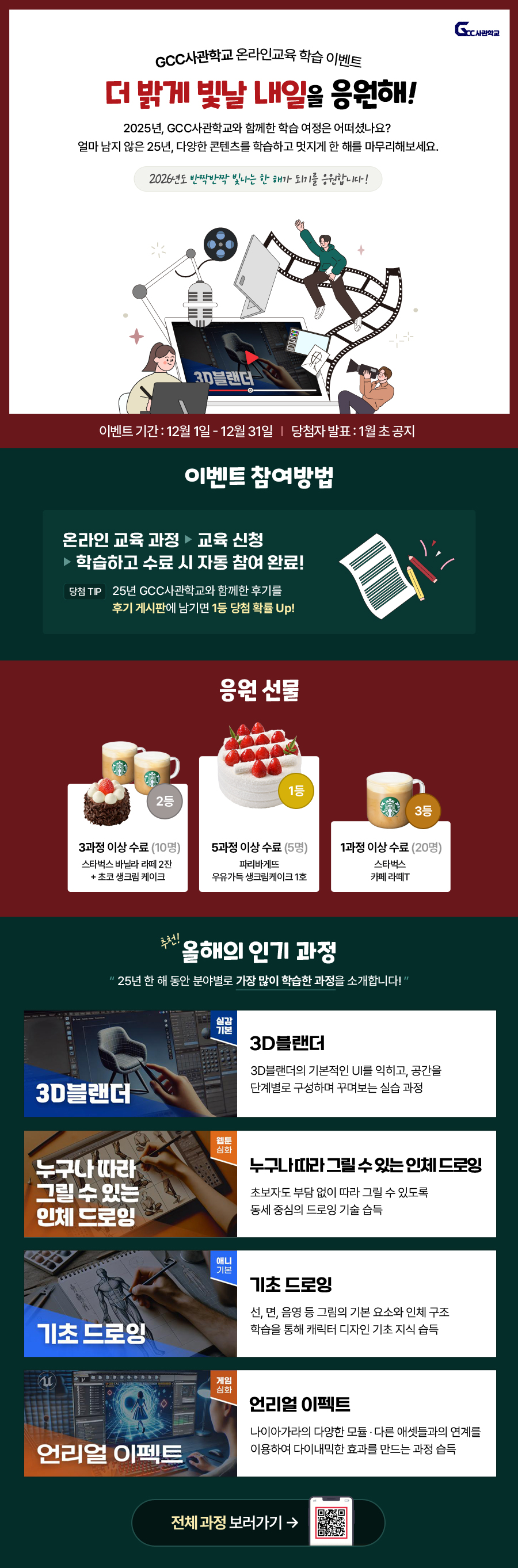 GCC사관학교에서 실무형 창작 교육을 학습하고 따뜻한 연말 선물 이벤트에도 도전해 보세요!