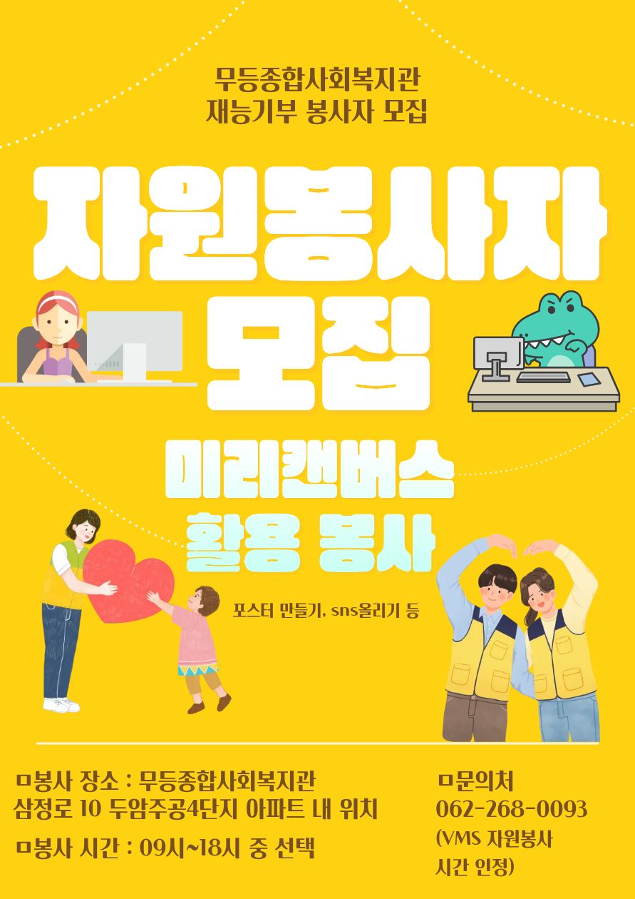 무등종합사회복지관에서 미리캔버스 활용가능한 자원봉사자를 모집합니다.